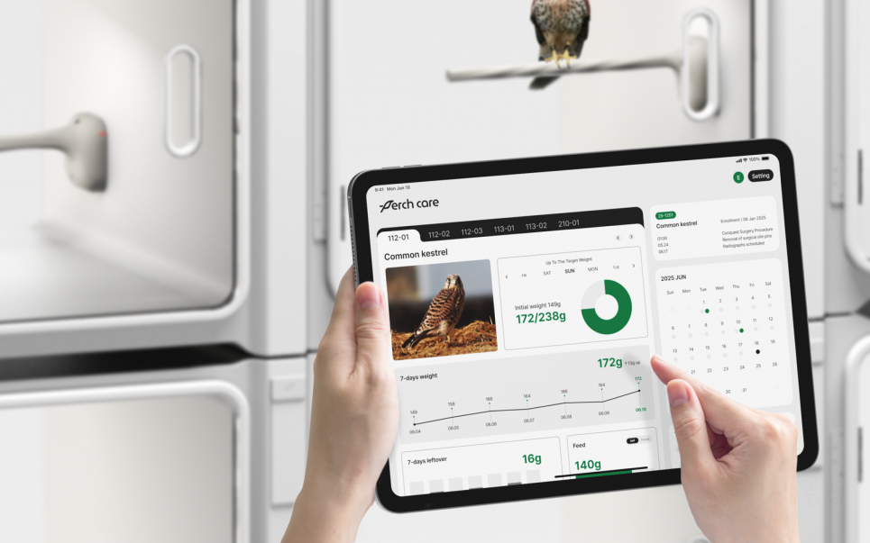 작품소개:PerchCare는 구조된 야생 조류의 재활 치료 과정에서 건강 상태와 치료 효과를 판단하는 핵심 지표인 체중을 스트레스 없이 측정할 수 있도록 설계된 스마트 횃대입니다. 기존의 포박 방식은 조류에게 극심한 스트레스를 유발해 건강을 해치거나 사망에 이르게 할 수 있으며, 관리사의 부상 위험도 동반합니다. 이와 달리 PerchCare는 케이지 내 횃대에 체중 감지 기능을 통합해, 조류가 횃대에 오르는 일상 활동 중 체중을 자동으로 측정함으로써 보다 안전하고 효율적인 재활 관리를 가능하게 합니다.
