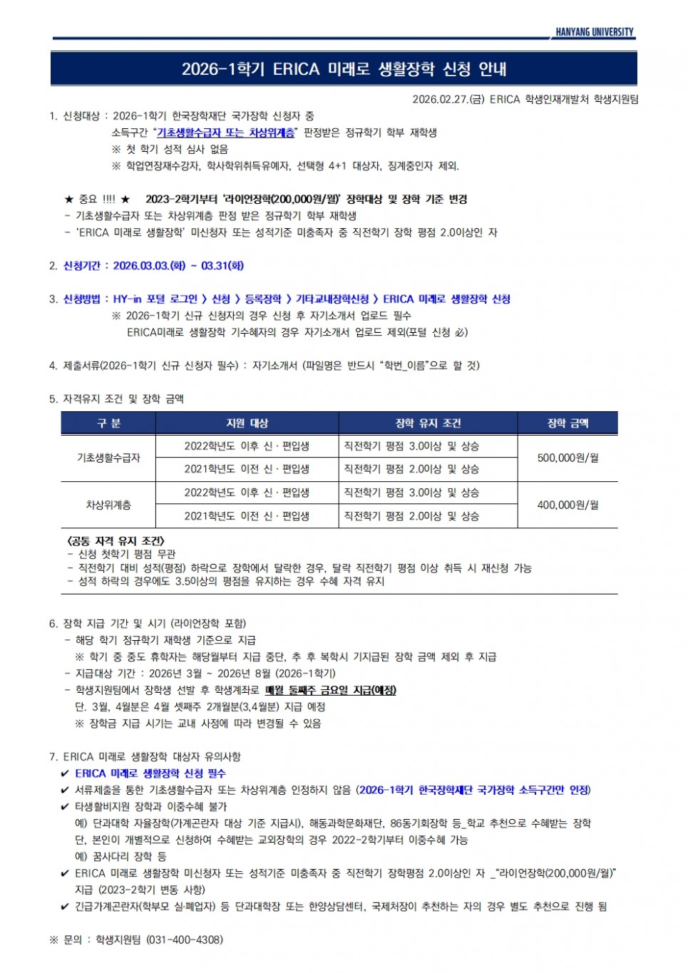 [장학] 2026-1학기「ERICA미래로 생활장학」신청 안내