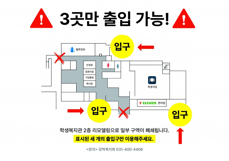학생복지관에 공간 구조 개선(푸드코트 및 임대매장 신설) 및 시설 리모델링으로 인하여 공사가 진행되고, 공사 기간( 12. 22.월 ~ 2026. 02. 28.토)동안 학생복지관 2층 출입은 지정된 출입구로만 가능합니다.