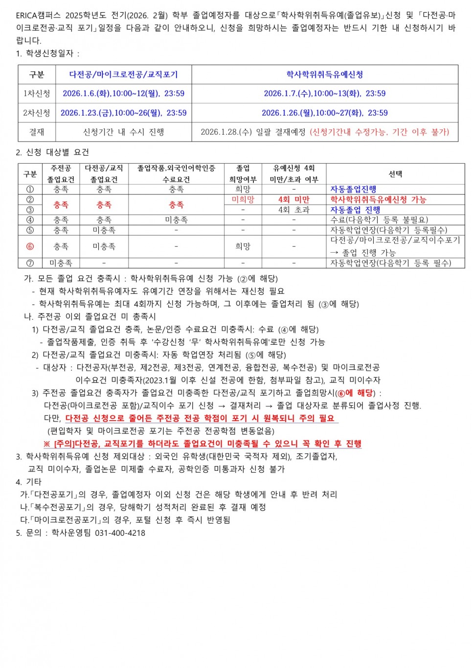 [학적] [ERICA] 2025학년도 전기(2026.2월) 졸업예정자의 「학사학위취득유예 신청」 및 「다전공.마이크로전공.교직포기」 안…