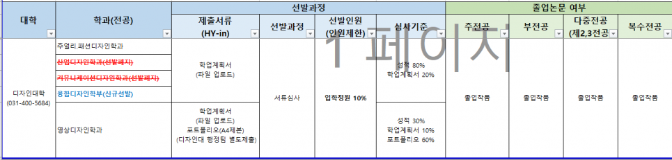 유의사항: 산업디자인학과 및 커뮤니케이션디자인학과는 융합디자인학부로 통합 운영함에 따라