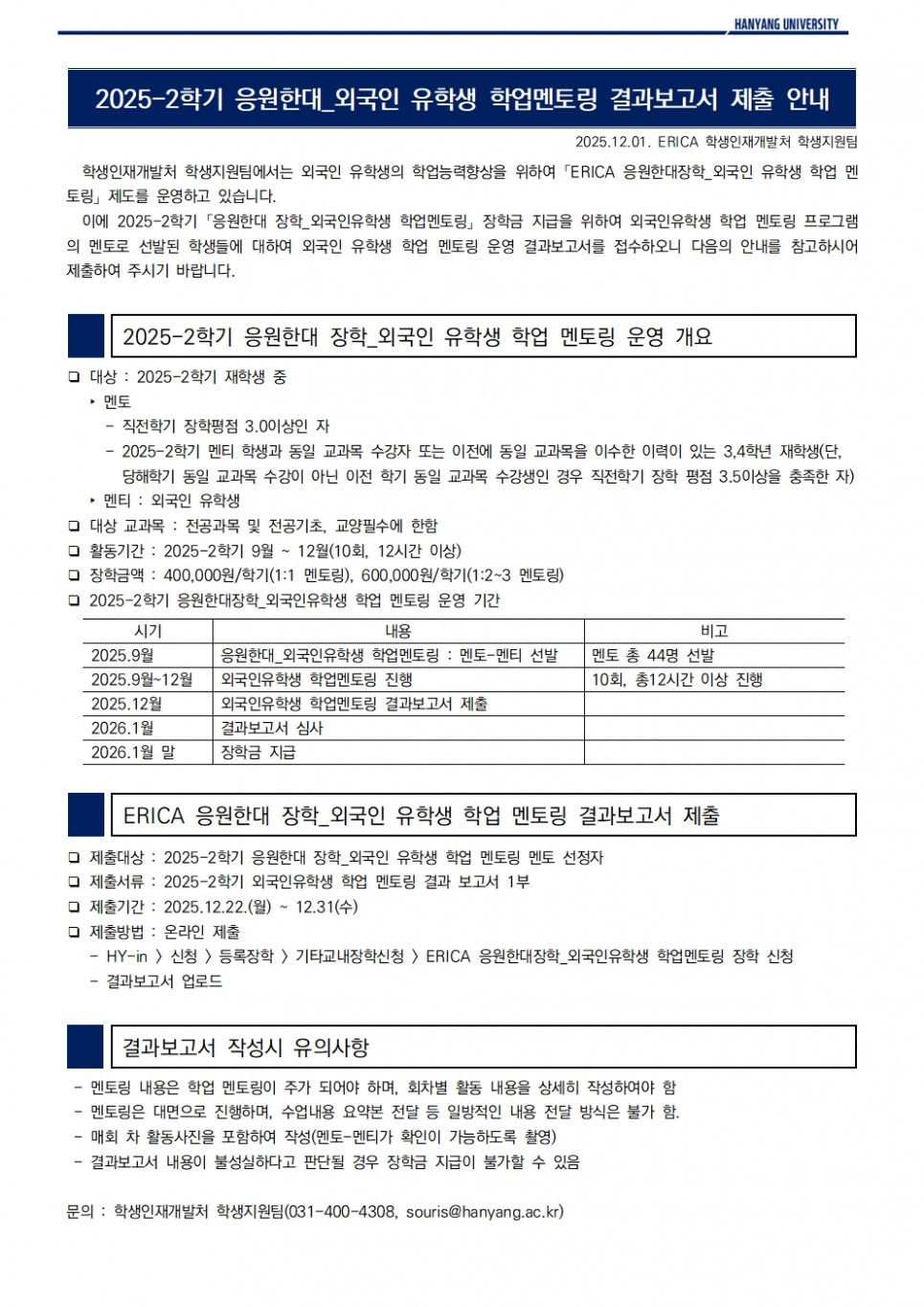 [장학] [ERICA] 2025-2학기 응원한대장학_외국인유학생 학업멘토링 결과보고서 제출 안내